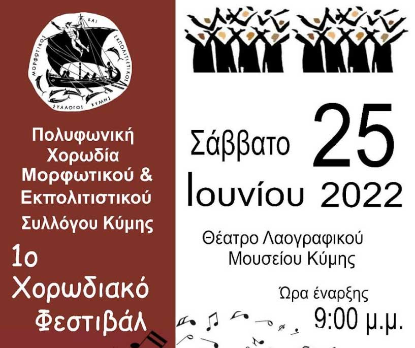 Το Σάββατο 25 Ιουνίου 2022 και ώρα 21:00 στο Θέατρο Λαογραφικού Μουσείου Κύμης θα πραγματοποιηθεί το 1ο Χορωδιακό Φεστιβάλ.