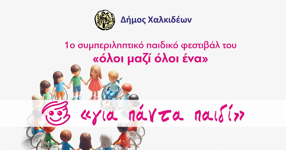 Ο Δήμος Χαλκιδέων, με αφορμή τη συμπλήρωση 1 έτους λειτουργίας του Γραφείου ΑμεΑ, διοργανώνει το 1ο Συμπεριληπτικό Παιδικό Φεστιβάλ Χαλκίδας «Για πάντα παιδί», το Σάββατο 21 Σεπτεμβρίου και την Κυριακή 22 Σεπτεμβρίου 2024, στο Πάρκο του Λαού, υπό την αιγίδα της UNICEF και με τη συνεργασία και στήριξη Σχολείων, Φορέων, Συλλόγων, Σωματείων, Εταιρειών και εθελοντικών οργανώσεων.