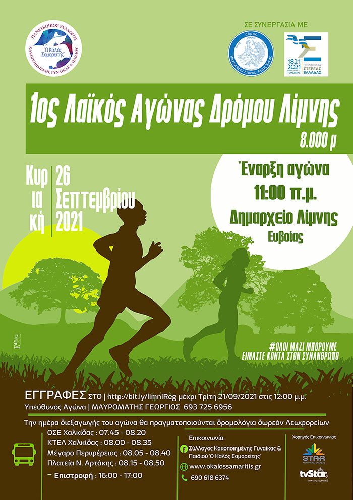 Ο Πανευβοικός Σύλλογος “Ο ΚΑΛΟΣ ΣΑΜΑΡΕΙΤΗΣ” θέλοντας να ενισχύσει την δοκιμαζόμενη από τις πυρκαγιές Βόρεια Εύβοια,θα πραγματοποιήσει την Κυριακή 26 Σεπτεμβρίου 2021 σε συνεργασία με το Δήμο Μαντουδίου-Λίμνης-Αγ.Αννας και την Περιφέρεια Στερεάς Ελλάδας, τον 1ο Λαϊκό Αγώνα δρόμου 8 χιλιομέτρων στη Λίμνη Ευβοίας.
