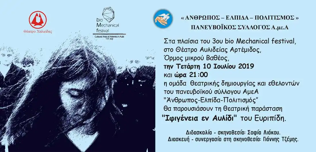 Η Ομάδα Θεατρικής Δημιουργίας ΑμεΑ και οι εθελοντές του Πανευβοϊκού Συλλόγου “Άνθρωπος-Ελπίδα-Πολιτισμός” στα πλαίσια του 3ου bio Mechanical festival στο Θέατρο Αυλιδείας Αρτέμιδος , Όρμος Μικρού Βαθέος θα παρουσιάσουν τη Θεατρική Παράσταση “Ιφιγένεια εν Αυλίδι” του Ευριπίδη.