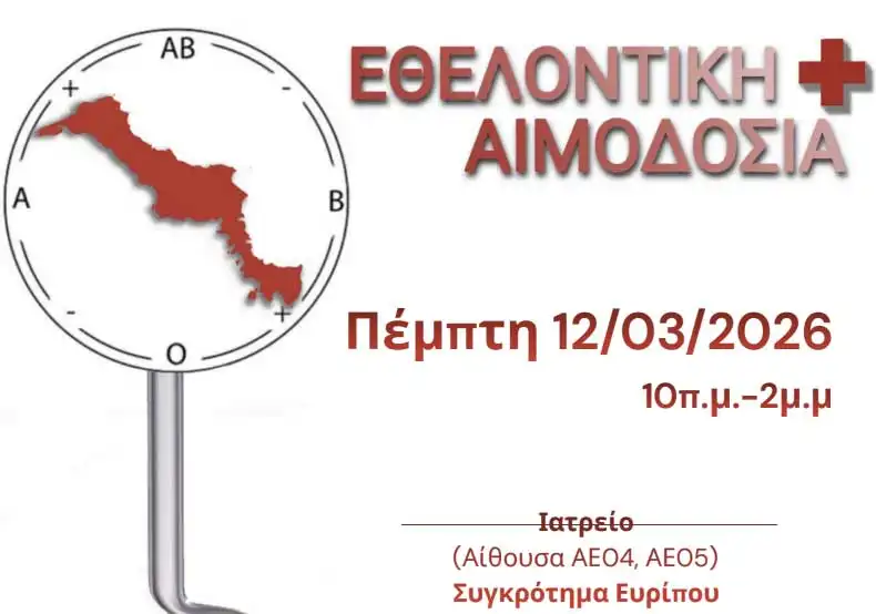 Η Φοιτητική Ομάδα Εθελοντικής Αιμοδοσίας Ευρίπου διοργανώνει εθελοντική αιμοδοσία την Πέμπτη 12 Μαρτίου, συμβάλλοντας ενεργά στην ενίσχυση των αποθεμάτων αίματος και στην καλλιέργεια πνεύματος κοινωνικής προσφοράς και αλληλεγγύης.