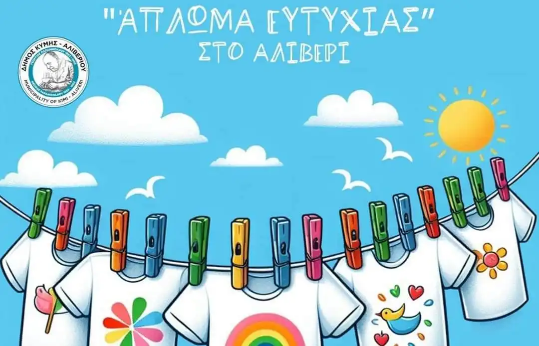 Ο δήμος Κύμης-Αλιβερίου και o Σύλλογος «Φλόγα» διοργανώνουν δράση για παιδιά με τίτλο “Άπλωμα Ευτυχίας”. Η πολύχρωμη μπουγάδα της ευτυχίας θα απλωθεί το Σάββατο 18 Μάϊου 2024, από τις 11:00 ως τις 14:00 στο Αλιβέρι.