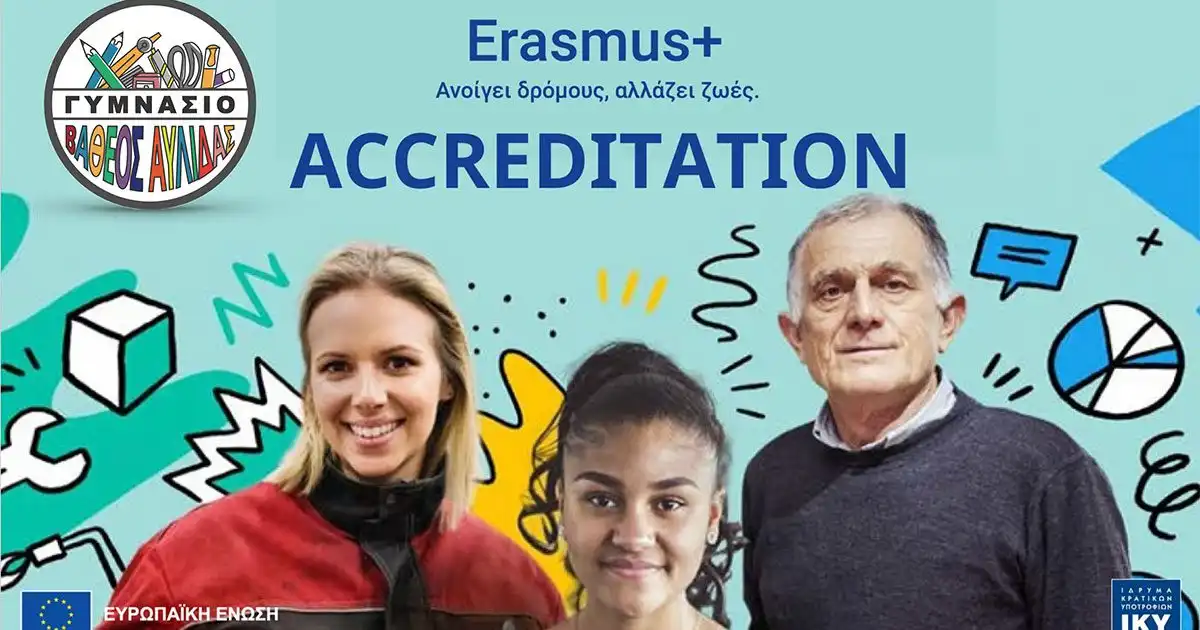 Βρισκόμαστε στην εξαίρετη θέση να σας ανακοινώσουμε πως το Ίδρυμα Κρατικών Υποτροφιών (Ι.Κ.Υ.) ενέκρινε το στρατηγικό σχέδιο που υπέβαλε το Γυμνάσιο Βαθέος Αυλίδας, στο πλαίσιο της Ευρωπαϊκής Πρόσκλησης Υποβολής Προτάσεων για Διαπίστευση απονέμοντας μας τη Διαπίστευση Erasmus (Accreditation 2021-2027) στον τομέα της Σχολικής Εκπαίδευσης.