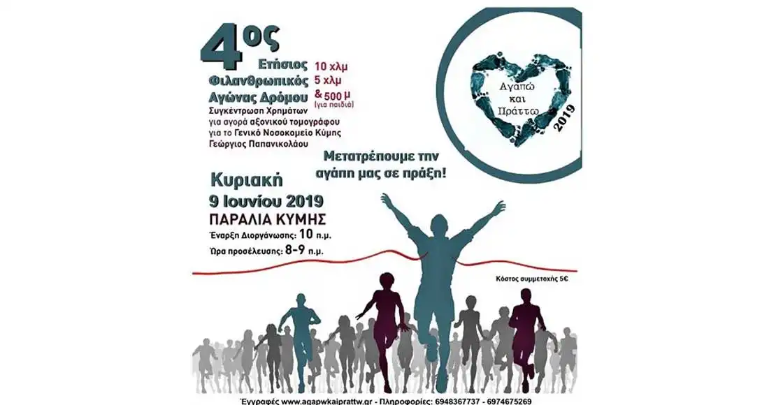 Το φιλανθρωπικό σωματείο «Αγαπώ και Πράττω» διοργανώνει τον 4ο ετήσιο φιλανθρωπικό αγώνα δρόμου του, την Κυριακή 9 Ιουνίου 2019 στις 10:00π.μ. και σας καλεί όλους να συμμετάσχετε μετατρέποντας την αγάπη σας σε πράξη.