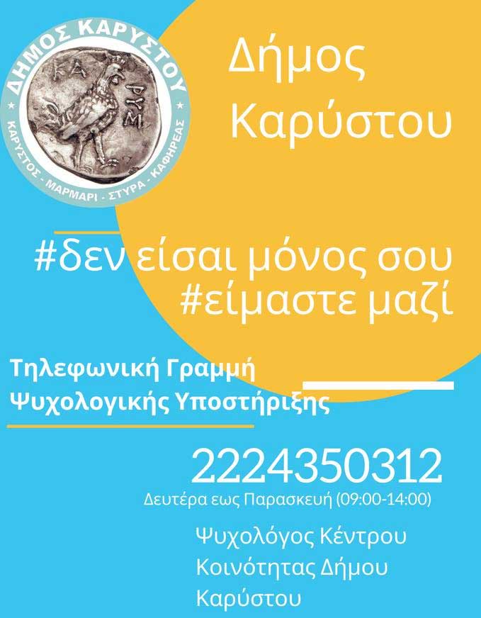 Ο Δήμος Καρύστου εγκαινιάζει σήμερα την νέα γραμμή ψυχολογικής υποστήριξης με το σύνθημα δεν είσαι μόνος σου, είμαστε μαζί.