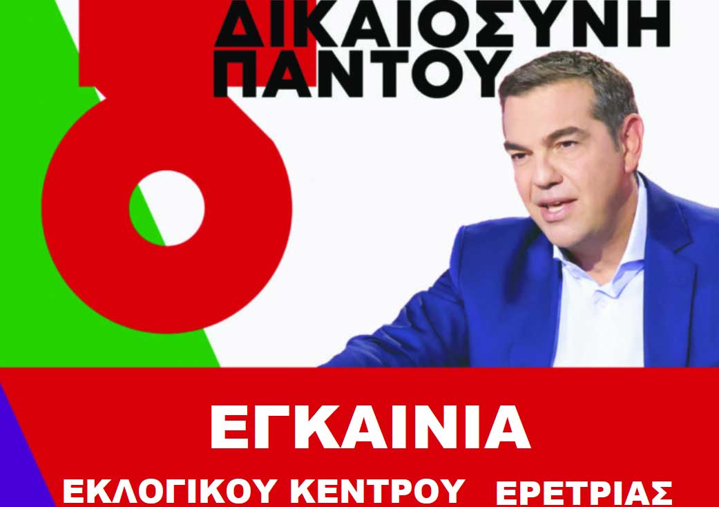 Τα εγκαίνια του εκλογικού κέντρου του ΣΥΡΙΖΑ στην Ερέτρια θα πραγματοποιηθεί την ΠΕΜΠΤΗ 4 Μαΐου και ώρα 19:30. Το εκλογικό κέντρο βρίσκεται στην οδό Φιλοσόφου Μενεδήμου 27.