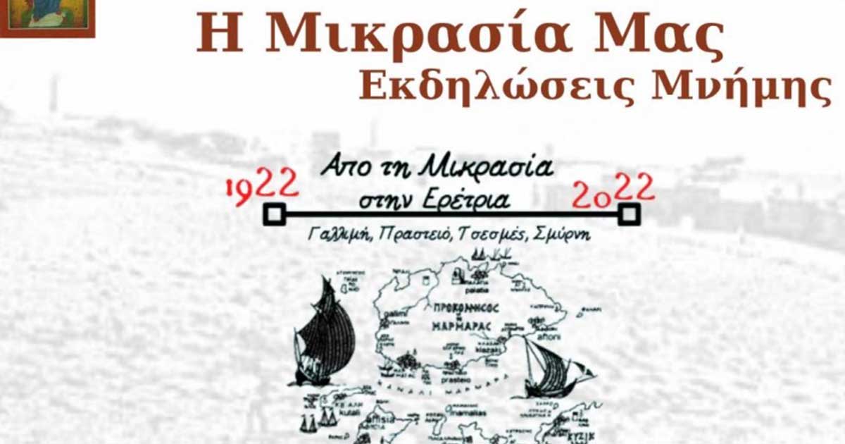 Τo Σάββατο 18 Ιουνίου 2022 και ώρα 20:30, στον προαύλιο χώρο του Ι. Ν. Παναγίας Παραβουνιώτισσας Ερέτριας, τιμούμε αυτή την επέτειο. Στόχος είναι να κρατηθεί ζωντανή η μνήμη των γεγονότων της μεγαλύτερης συμφοράς του Ελληνισμού, μετά την Άλωση, χωρίς μισαλλοδοξία, αλλά με την ανάδειξη της Ιστορίας και σκοπό να μην επαναληφθούν τέτοια εγκλήματα στην ανθρωπότητα.