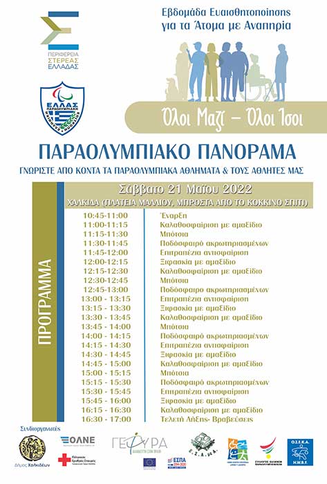 Στο πλαίσιο της εβδομάδας ευαισθητοποίησης για τα άτομα με αναπηρία διοργανώνονται επιδείξεις Παραολυμπιακών Αθλημάτων από καταξιωμένους Έλληνες αθλητές με αναπηρία και Παραολυμπιονίκες που θα πραγματοποιηθούν το Σάββατο 21 Μαΐου 2022 και από τις 11:00 στην Χαλκίδα μπροστά από το κόκκινο σπίτι.
