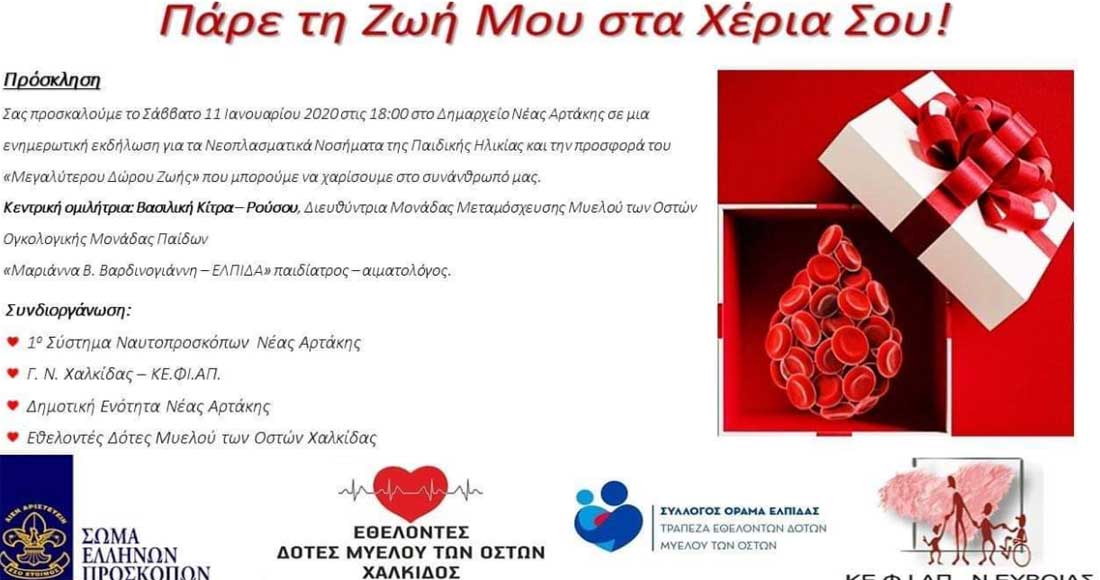 Το 1ο Σύστημα Ναυτοπροσκόπων Νέας Αρτάκης διοργανώνει το Σάββατο 11 Ιανουαρίου 2020 και ώρα 18:00 στο Δημαρχείο Νέας Αρτάκης ενημερωτική εκδήλωση για τα Νεοπλασματικά Νοσήματα της Παιδικής Ηλικίας και την προσφορά του Μεγαλύτερη Δώρου Ζωής που μπορούμε να χαρίσουμε στον συνάνθρωπο μας.