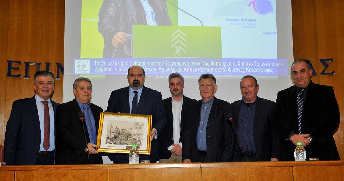 Στη συνέχεια η διοίκηση του Επιμελητηρίου Εύβοιας βράβευσε τον Υφυπουργό στον Πρωθυπουργό κ. Χρήστο Τριαντόπουλο, για την καθοριστική συμβολή του στην επανεκκίνηση της οικονομίας της Β. Εύβοιας μετά τις καταστροφικές πυρκαγιές του 2021. Ο κ. Γεροντίτης υπογράμμισε κατά τη βράβευση ότι ο κ. Τριαντόπουλος – ένας δικός μας πλέον άνθρωπος όπως τον χαρακτήρισε – με περίσσια θέληση και αποφασιστικότητα, με αδιάκοπο τρέξιμο, στάθηκε με τις ενέργειες του αποφασιστικός παράγοντας για την θέσπιση μέτρων ανακούφισης των πληγέντων και στη συνέχεια μέτρων επανεκκίνησης της τοπικής επιχειρηματικότητας. Την τιμητική πλακέτα παρέδωσαν στον Υφυπουργό τα μέλη της Δ.Ε. του Επιμελητηρίου.