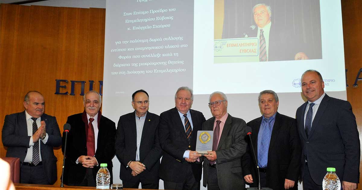 Πέραν αυτών η διοίκηση του Επιμελητηρίου απένειμε ξεχωριστή τιμή στον Επίτιμο Πρόεδρο, κ. Ευάγγελο Σταύρου, για την πολύτιμη δωρεά στο Φορέα, συλλογής εντύπου και αναμνηστικού υλικού που συνέλλεξε κατά τη διάρκεια της μακρόχρονης θητείας του στη Διοίκηση του. Την τιμητική πλακέτα παρέδωσαν ο Γενικός Γραμματέας της ΚΕΕΕ και Πρόεδρος του Επιμελητηρίου Βοιωτίας κ. Παναγιώτης Αγνιάδης με τον Πρόεδρο της ΓΣΕΒΕΕ κ. Γιώργο Καββαθά.