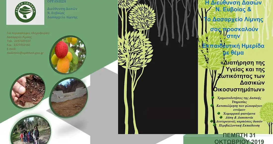 Η Διεύθυνση Δασών Εύβοιας και το Δασαρχείο Λίμνης διοργανώνουν την Πέμπτη 31 Οκτωβρίου 2019 θα πραγματοποιηθεί εκπαιδευτική ημερίδα με θέμα “Διατήρηση της υγείας και της ζωτικότητας των δασικών οικοσυστημάτων” στο Κινηματοθέατρο Ελυμνίων στην Λίμνη Ευβοίας.