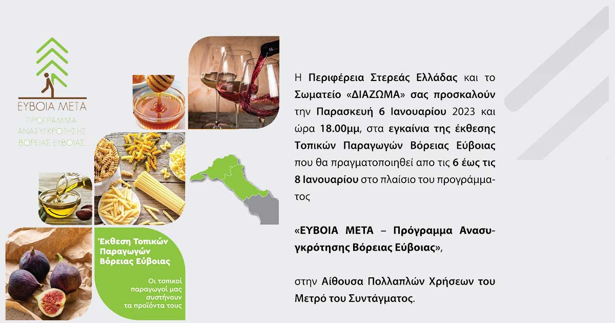 H Περιφέρεια Στερεάς Ελλάδας συνδιοργανώνει με το «ΔΙΑΖΩΜΑ» την «Έκθεση Τοπικών Παραγωγών Βόρειας Εύβοιας», η οποία θα πραγματοποιηθεί από τις 6 έως και τις 8 Ιανουαρίου 2023, στην Αίθουσα Πολλαπλών Χρήσεων, του Μετρό στο Σύνταγμα.
