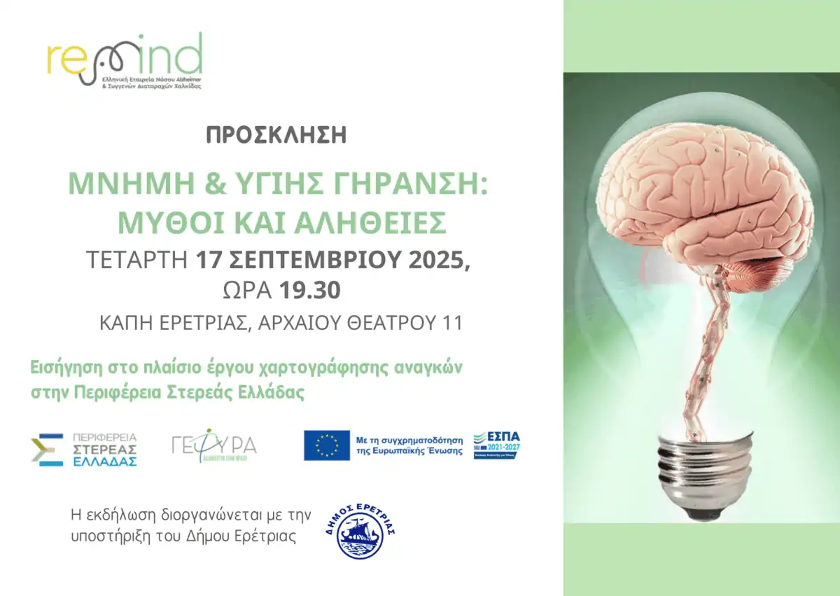 Η διαδρομή ενημέρωσης «Μνήμη & Υγιής Γήρανση, Μύθοι και Αλήθειες» συνεχίζεται! Η REMIND-Alzheimer Χαλκίδας, σε συνεργασία με την Περιφέρεια Στερεάς Ελλάδας και με την υποστήριξη του Δήμου Ερέτριας, σας προσκαλούν σε μια ανοιχτή ενημερωτική εκδήλωση για την πρόληψη, την έγκαιρη διάγνωση και την καθημερινή φροντίδα.