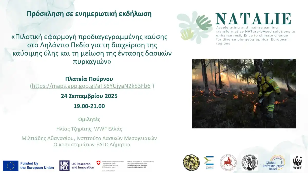 Σημαντική ενημερωτική εκδήλωση με θέμα «Πιλοτική εφαρμογή προδιαγεγραμμένης καύσης στο Ληλάντιο Πεδίο για τη διαχείριση της καύσιμης ύλης και τη μείωση της έντασης δασικών πυρκαγιών» θα πραγματοποιηθεί την Τετάρτη 24 Σεπτεμβρίου 2025, από τις 19:00 έως τις 21:00, στην Πλατεία Πούρνου.