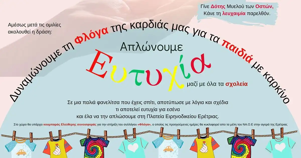 Μετά τις ομιλίες, θα πραγματοποιηθεί η πανελλήνια δράση «ΑΠΛΩΝΩ ΕΥΤΥΧΙΑ» όπου οι μαθητές όλων των σχολικών βαθμίδων του Δήμου Ερέτριας, μετά από συζητήσεις σχετικά με την έννοια και τη φιλοσοφία του εθελοντισμού με τους δασκάλους και τους καθηγητές τους, κάτοικοι και φορείς, θα «απλώσουν» μια πρωτότυπη μπουγάδα στη πλατεία Ειρηνοδικείου, δείχνοντας με τον τρόπο αυτό τι σημαίνει ευτυχία για τον καθένα και πως μπορούμε να τη μοιραστούμε με τους συνανθρώπους μας. Σε μια παλιά φανελίτσα που έχουμε στο σπίτι, όσα παιδιά και πολίτες επιθυμούν θα αποτυπώσουν με λόγια και σχέδια τι αποτελεί για το καθένα ευτυχία ενώ παράλληλα θα υπάρχει κουμπαράς ελεύθερης συνεισφοράς για τη στήριξη της «Φλόγας»