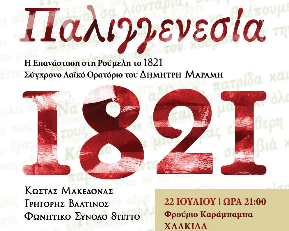 Στο Φρούριο Καράμπαμπα της Χαλκίδας, την Πέμπτη 22 Ιουλίου 2021 και ώρα 21:00, θα παρουσιαστεί το σύγχρονο Λαϊκό Ορατόριο με τίτλο: «Παλιγγενεσία – Η Επανάσταση στη Ρούμελη το 1821» του συνθέτη Δημήτρη Μαραμή, με ερμηνευτή τον Κώστα Μακεδόνα, στο ρόλο του αφηγητή τον Γρηγόρη Βαλτινό και ως “χορό” του μουσικού δράματος το φωνητικό σύνολο 8tetto.