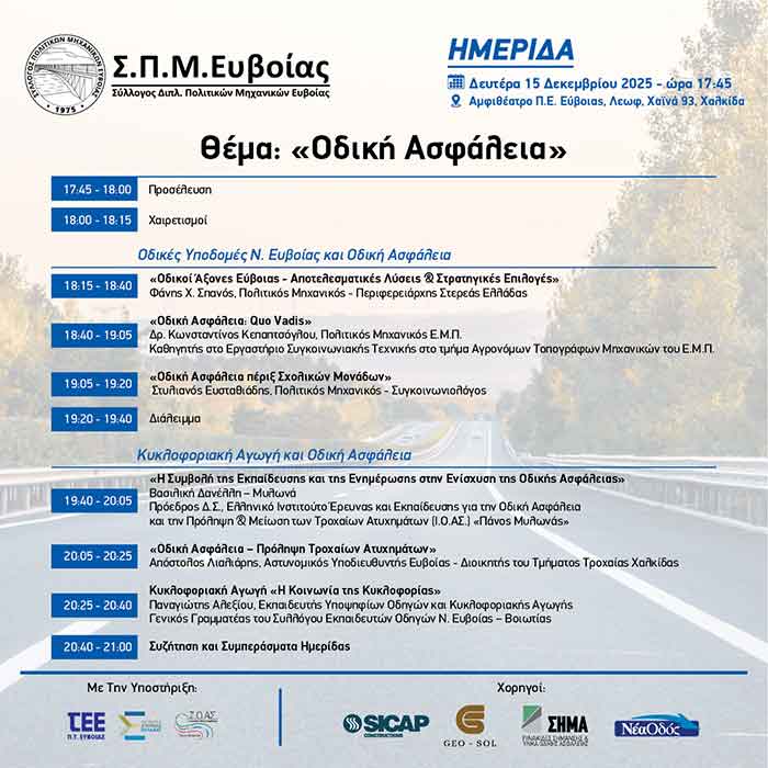 Σε μια περίοδο που η οδική ασφάλεια αποτελεί μείζον εθνικό και τοπικό ζήτημα, ο Σύλλογος Διπλωματούχων Πολιτικών Μηχανικών Νομού Ευβοίας αναλαμβάνει δράση, διοργανώνοντας μια εξαιρετικά ενδιαφέρουσα ημερίδα με θέμα: «Οδική Ασφάλεια».