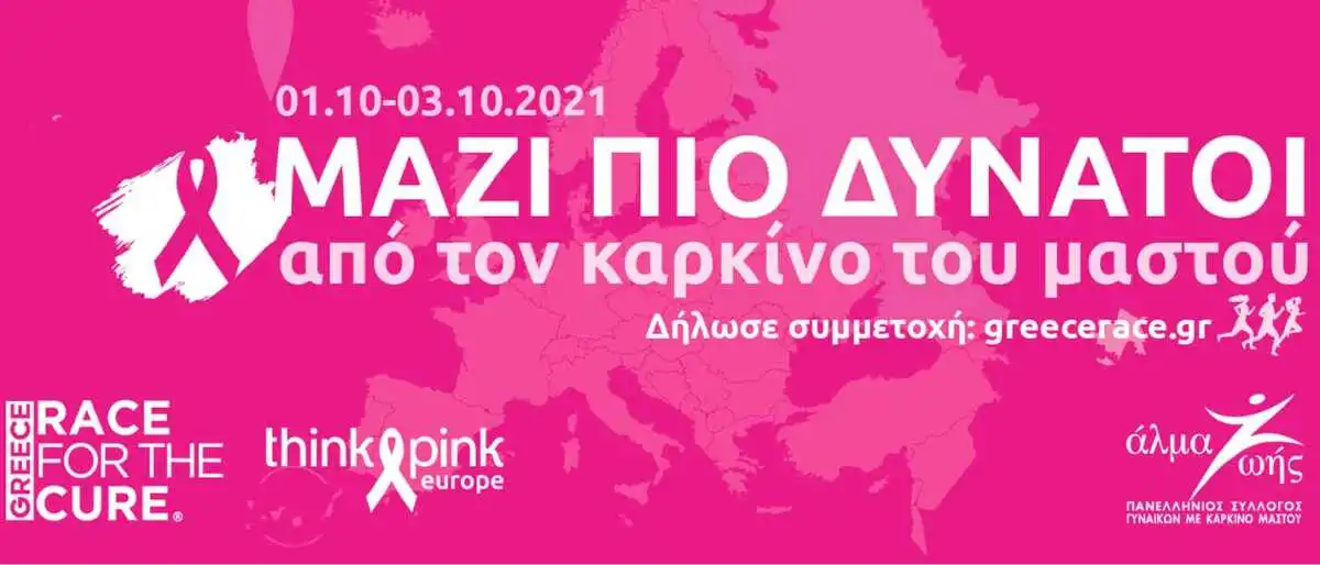 Ο Πανελλήνιος Σύλλογος Γυναικών με Καρκίνο Μαστού «Άλμα Ζωής» σας προσκαλεί 1, 2 & 3 Οκτωβρίου 2021 να τρέξετε και να περπατήσετε για ακόμα μια χρονιά τον δικό σας αγώνα Race for the Cure® διαδικτυακά, όπου και αν βρίσκεστε, ενισχύοντας τα προγράμματα του Συλλόγου «Άλμα Ζωής» στην Ελλάδα.