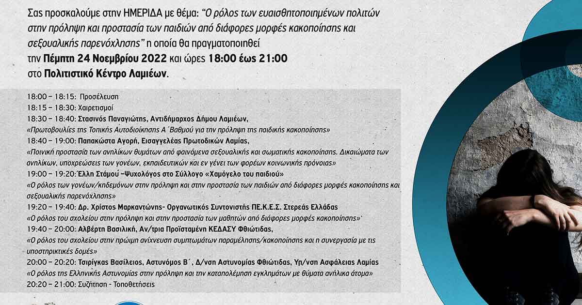 Το Περιφερειακό Κέντρο Εκπαιδευτικού Σχεδιασμού (ΠΕ.Κ.Ε.Σ.) Στερεάς Ελλάδας στο πλαίσιο της διαρκούς επιστημονικής και παιδαγωγικής ενημέρωσης και υποστήριξης όλων των εκπαιδευτικών Α/θμιας και Β/θμιας Εκπαίδευσης, σε συνεργασία με τον Δήμο Λαμιέων και το Χαμόγελο του Παιδιού διοργανώνει Ημερίδα, με θέμα: «Ο ρόλος των ευαισθητοποιημένων πολιτών στην πρόληψη και προστασία των παιδιών από διάφορες μορφές κακοποίησης και σεξουαλικής κακοποίησης»