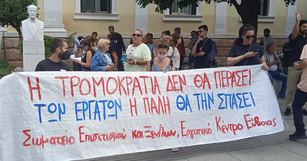 Στο πλευρό του 24χρονου βρέθηκαν συνάδελφοι του, εκπρόσωποι Σωματείων της περιοχής και εργαζόμενοι που ανταποκρίθηκαν στο κάλεσμα του Εργατικού Κέντρου Εύβοιας και του Συνδικάτου Επισιτισμού και Ξενοδοχοϋπαλλήλων Ευβοίας, στέλνοντας μήνυμα ότι «η τρομοκρατία δεν θα περάσει, των εργατών η πάλη θα τη σπάσει».