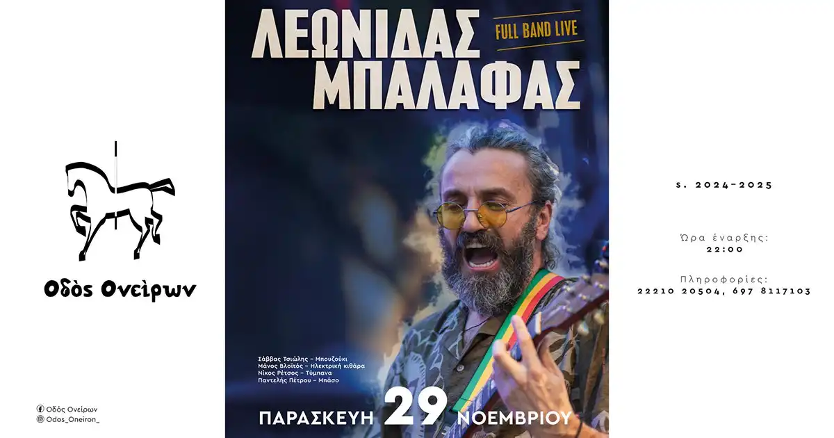 Με το χαρακτηριστικό και ιδιαίτερο μουσικό του ύφος, ο Λεωνίδας Μπαλάφας συνδυάζει σύγχρονα και παραδοσιακά στοιχεία, δημιουργώντας έναν ήχο που τον καθιστά αναγνωρίσιμο και αγαπητό στο κοινό του. Ο αγαπημένος καλλιτέχνης θα παρουσιάσει μια ολοκληρωμένη μουσική εμπειρία, που θα περιλαμβάνει αγαπημένα τραγούδια του, καθώς και νέες συνθέσεις που αναδεικνύουν την εξέλιξή του ως καλλιτέχνη.