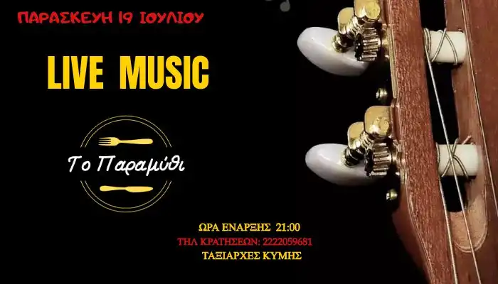Οι εκπλήξεις όμως δεν σταματούν εδώ, καθώς πλήθος μουσικών ζωντανά που πραγματοποιούνται στο όμορφο Παραμύθι. Στις 19 Ιουλίου έρχεται ένα ξεχωριστό live με μουσικούς από την ευρύτερη περιοχή της Κύμης, το οποίο αναμένεται να σας χαρίσει μοναδικές στιγμές διασκέδασης που θα θυμάστε για καιρό.