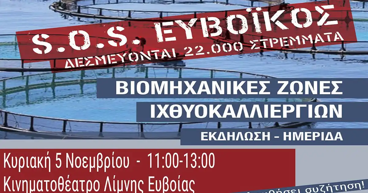 Την Κυριακή 5 Νοεμβρίου και ώρα 11:00 θα πραγματοποιηθεί στο κινηματοθέατρο “Ελύμνιον”, στην Λίμνη Ευβοίας, ενημερωτική εκδήλωση για την βιομηχανική ανάπτυξη ιχθυοκαλλιεργειών σε όλον τον Ευβοϊκό. Η θάλασσα του Ευβοϊκού, αλλά και χερσαία τμήματα του πανέμορφου νησιού μας, κινδυνεύουν από μια νέα επιδρομή με [...]