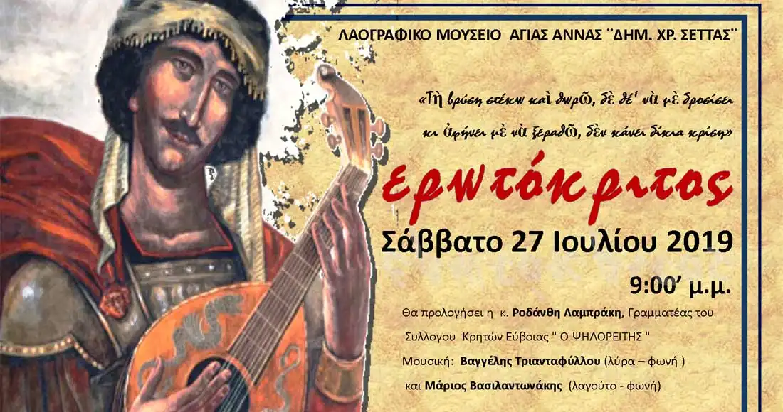 Θα προλογίσει η κ. Ροδάνθη Λαμπράκη, γραμματέας του συλλόγου Κρητών Εύβοιας “Ο Ψηλορείτης”.