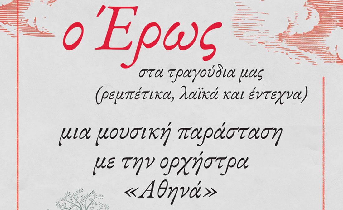 Το Εργαστήρι Καλλιτεχνικής Παιδείας σας προσκαλεί στην μουσική παράσταση ο Έρως στα τραγούδια μας (ρεμπέτικα, λαϊκά και έντεχνα) με την ορχήστρα «Αθηνά» που θα πραγματοποιηθεί την Παρασκευή 14 Φεβρουαρίου 2020 με έναρξη 21:00 στον χώρο πολιτισμού «Αθηνά» Σιώκου 5, πλησίον του θεάτρου Παπαδημητρίου.