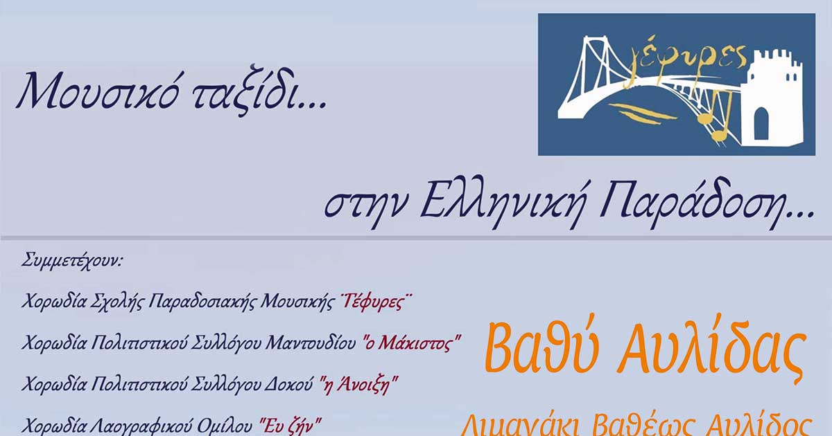 Συμμετέχουν οι Χορωδίες: Σχολής Παραδοσιακής μουσικής «Γέφυρες», Μαντουδίου «Μάκιστος», Δοκού «Η Άνοιξη», Ιερού Ναού «Αγίου Χριστοφόρου» Βαθέως Αυλίδας, Λαογραφικού Ομίλου «Ευ Ζην» και 14μελης Ορχήστρα της Σχολής παραδοσιακών οργάνων «Γέφυρες».