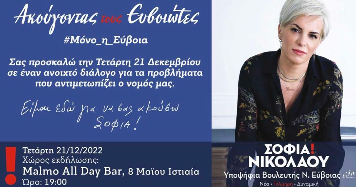 Η υποψήφια βουλευτής Νέας Δημοκρατίας στην Εύβοια, προσκαλεί αυτή τη φορά όλους τους πολίτες σε μια συνάντηση στην Ιστιαία, την Τετάρτη 21 Δεκεμβρίου, στις 7 το απόγευμα, στο Malmo All Day Bar, στην πλατεία της πόλης.