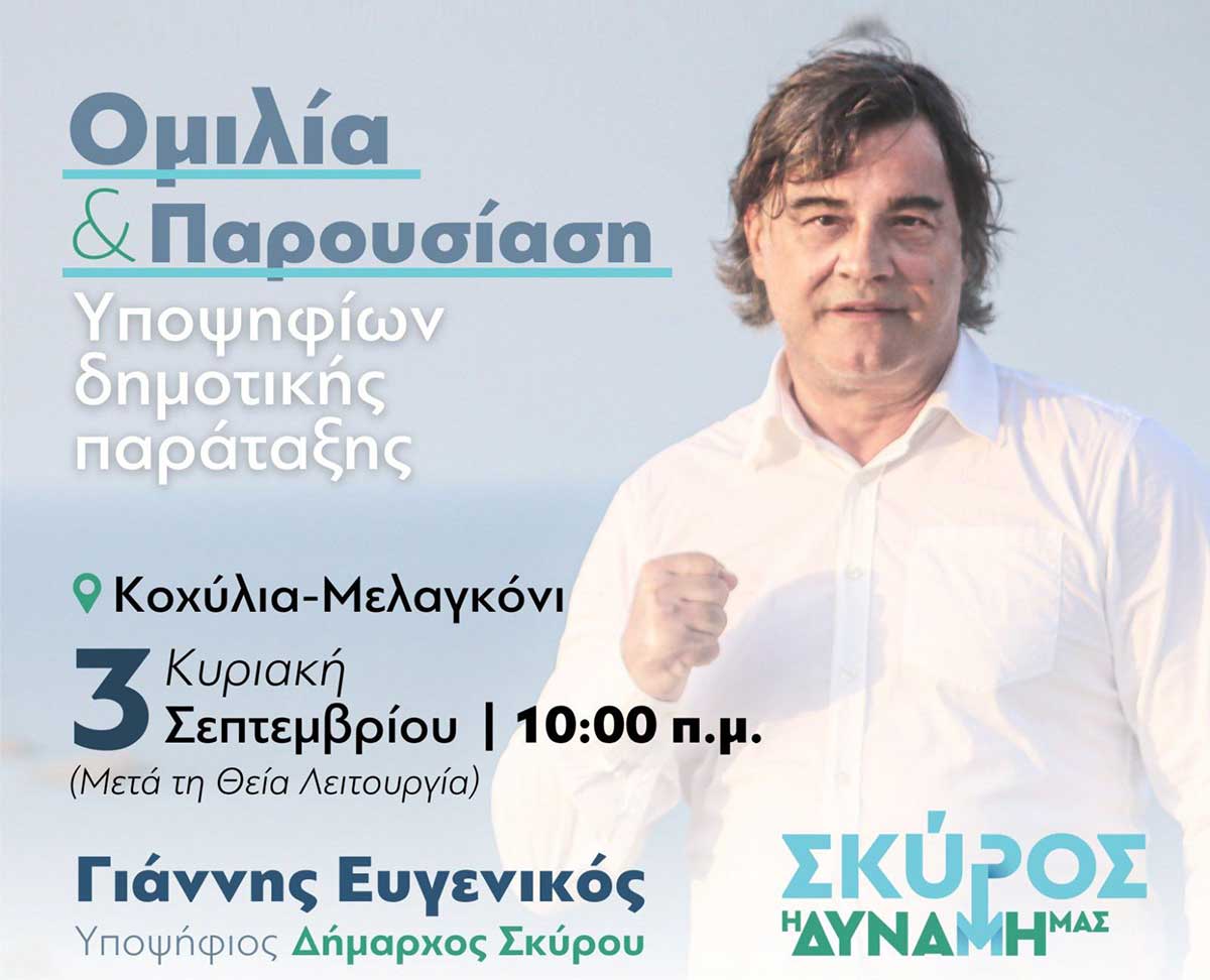 Ο υποψήφιος δήμαρχος Σκύρου και επικεφαλής του συνδυασμού “Σκύρος η δύναμη μας” Γιάννης Ευγενικός, θα παρουσιάσει τον συνδυασμό του την Κυριακή 3 Σεπτεμβρίου 2023 και ώρα 10:00 στα Κοχύλια.