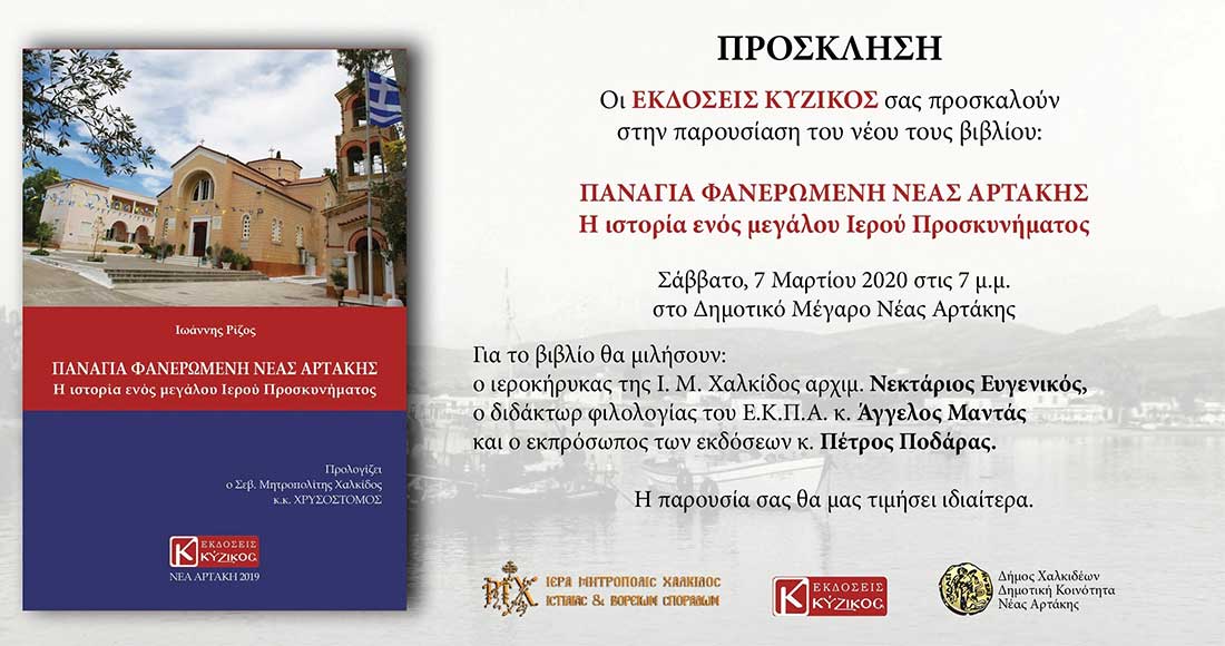 Οι Εκδόσεις Κυζίκος παρουσιάζουν το νέο τους βιβλίο “Παναγία Φανερωμένη Νέας Αρτάκης – Η Ιστορία ενός μεγάλου Ιερού Προσκυνήματος” το Σάββατο 7 Μαρτίου 2020 και ώρα 19:00 στο Δημοτικό Μέγαρο Νέας Αρτάκης.