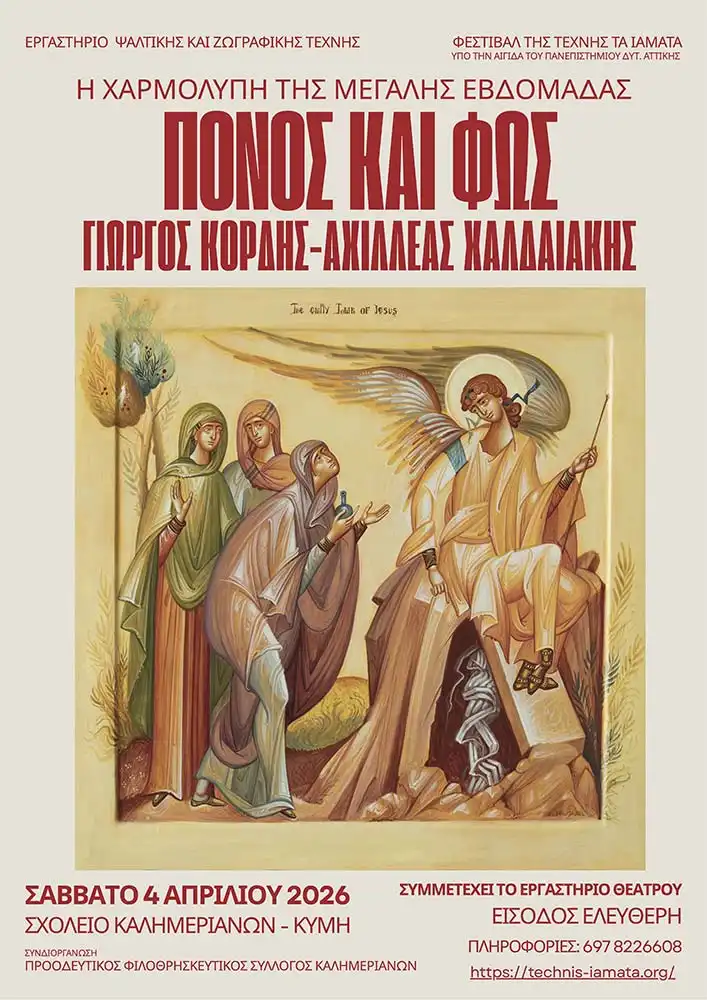 Μια ιδιαίτερη καλλιτεχνική και εκπαιδευτική δράση με θέμα τη χαρμολύπη ως αισθητική και υπαρξιακή εμπειρία της ορθόδοξης τέχνης θα πραγματοποιηθεί στο Σχολείο Καλημεριάνων της Κύμης, στο πλαίσιο του Φεστιβάλ «Της Τέχνης τα Ιάματα».