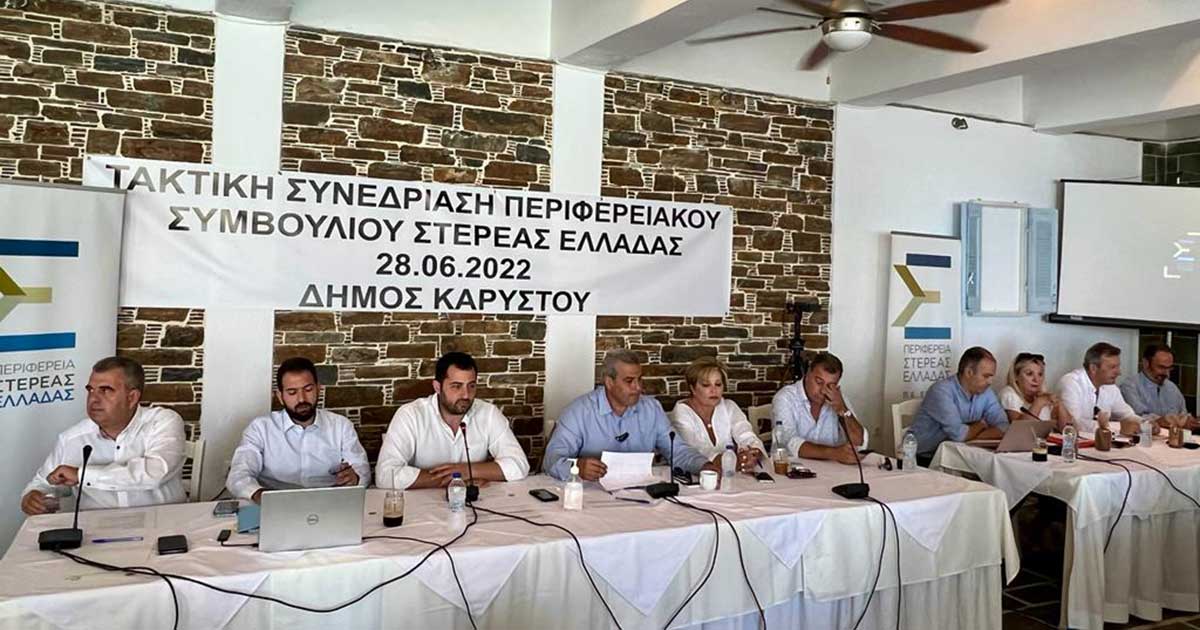 Η 13η Τακτική Συνεδρίαση του Περιφερειακού Συμβουλίου Στερεάς Ελλάδας πραγματοποιήθηκε σήμερα, Τρίτη 28 Ιουνίου 2022, στην πόλη της Καρύστου και πέραν των θεμάτων της ημερήσιας διάταξης, επικεντρώθηκε σε ζητήματα της ευρύτερης περιοχής, αφού κατόπιν προσκλήσεως του Προέδρου, παρευρέθηκε πλήθος θεσμικών φορέων του τόπου, οι οποίοι έλαβαν τον λόγο στο πλαίσιο της διαλογικής συζήτησης.