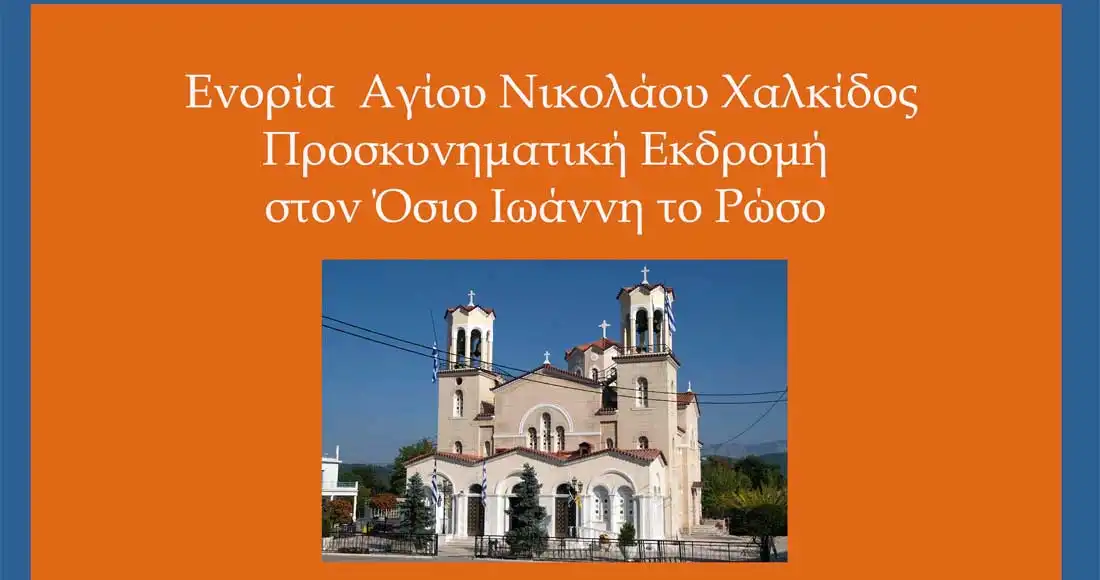 Το Σάββατο 8 Ιουνίου 2019 θα πραγματοποιηθεί προσκυνηματική εκδρομή στον Όσιο Ιωάννη το Ρώσσο, στο Προκόπι Ευβοίας, όπου και θα τελεστεί η Θεία Λειτουργία.