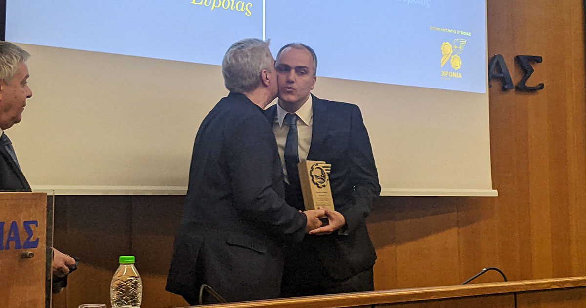 Ο κ. Κεδίκογλου παρέδωσε το τιμητικό βραβείο στον Αντιπεριφερειάρχη Π.Ε. Εύβοιας κ. Γιώργο Κελαϊδίτη, για το πολύτιμο έργο και την προσφορά του στο Νομό Εύβοιας από διάφορες θέσεις ευθύνης με προεξέχουσα του Αντιπεριφερειάρχη Π.Ε. Εύβοιας.