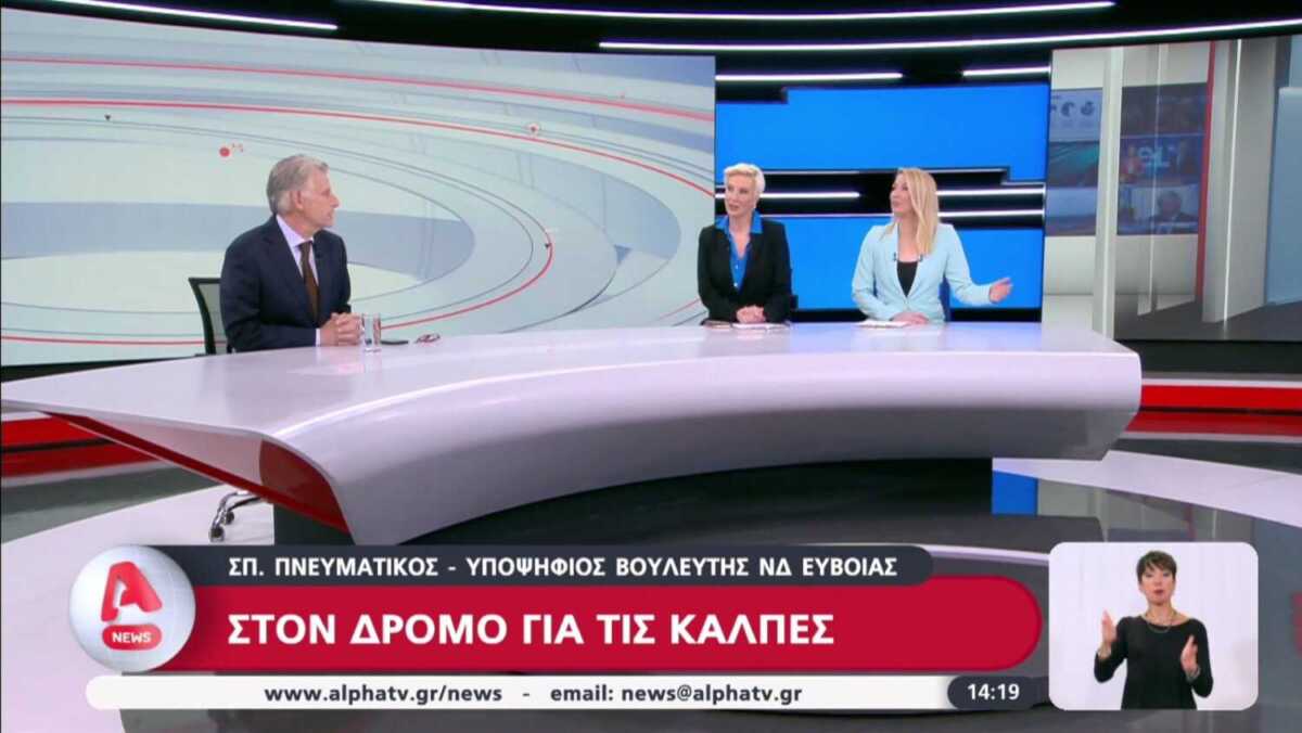 Για το διακύβευμα των εκλογών μίλησε ο υποψήφιος βουλευτής Εύβοιας της ΝΔ Σπύρος Πνευματικός στο μεσημεριανό δελτίο ειδήσεων της τηλεόραση του Alpha την Τρίτη 9 Μαΐου.