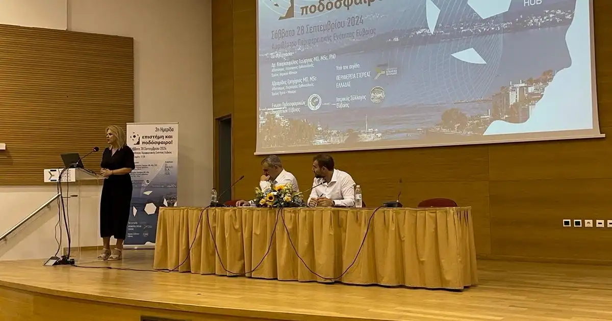 Στην 2η ημερίδα «Επιστήμη και ποδόσφαιρο», που πραγματοποιήθηκε χθες, Σάββατο 28 Σεπτεμβρίου 2024, από τον μη κερδοσκοπικό οργανισμό Obrela, σε συνεργασία με τον Αθλητίατρο-Χειρουργό Ορθοπαιδικό Δρ. Γεώργιο Κουρκουμέλη, τον Αθλητίατρο- Χειρούργο Ορθοπαιδικό Γρηγόριο Αβραμίδη και την Ένωση Ποδοσφαιρικών Σωματείων Εύβοιας, υπό την αιγίδα της Περιφέρειας Στερεάς Ελλάδας και του Ιατρικού Συλλόγου Εύβοιας, παρευρέθηκε η Δήμαρχος Χαλκίδεων Έλενα Βάκα.