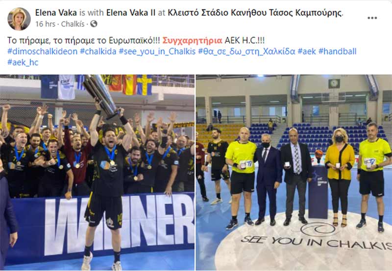 Η δήμαρχος Χαλκιδέων με ανάρτησή της στα social media δήλωσε: Το πήραμε, το πήραμε το Ευρωπαϊκό!!! Συγχαρητήρια ΑΕΚ Η.C.!!!