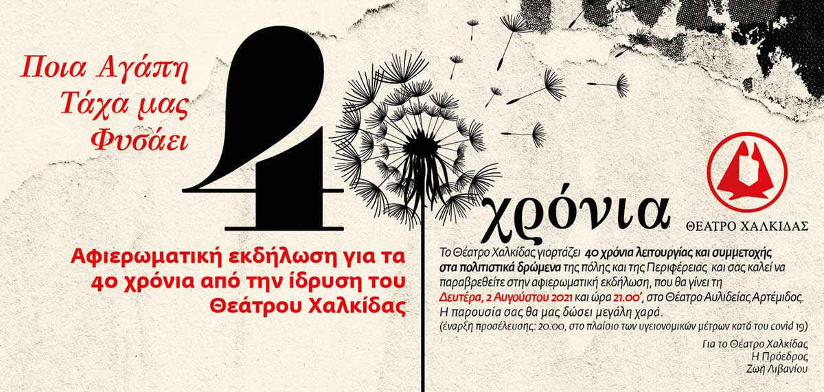 Την Δευτέρα 2 Αυγούστου 2021, το Θέατρο Χαλκίδας γιορτάζει τα 40 χρόνια από την ίδρυση του με μια εκδήλωση γεμάτη αναμνήσεις αλλά και στόχους για το μέλλον του πολιτισμού στην Εύβοια και τη Στερεά Ελλάδα.