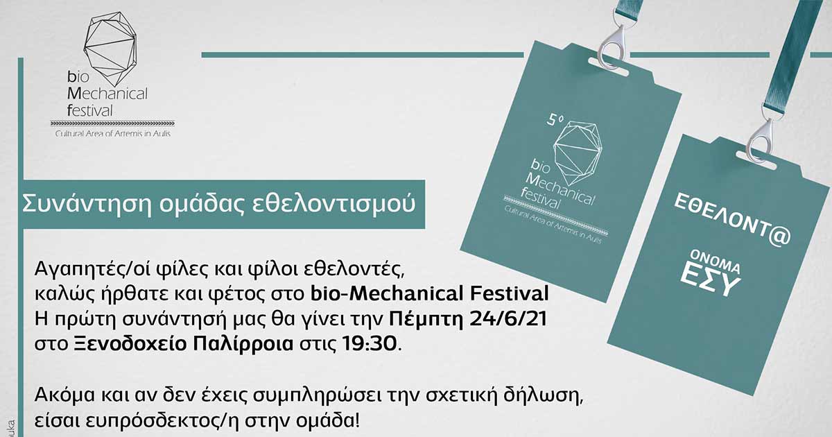 Αγαπητές/οί φίλες και φίλοι εθελοντές, καλώς ήρθατε και φέτος στο bio Mechanical Festival. Η πρώτη συνάντησή μας θα γίνει την Πέμπτη 24/6/21 στο Ξενοδοχείο Παλίρροια στις 19:30.