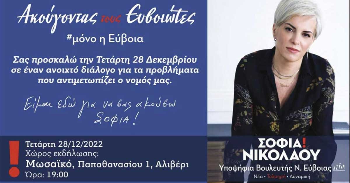 Λίγο πριν από το κλείσιμο της χρονιάς η πρώην Γενική Γραμματέας Αντεγκληματικής Πολιτικής, διοργανώνει την τρίτη συγκέντρωση, αυτή τη φορά στο δήμο Κύμης – Αλιβερίου. Στις 7 το απόγευμα στο καφέ «Μωσαϊκό», στο Αλιβέρι, η κ. Νικολάου θα υποδεχθεί όλους τους πολίτες που θέλουν να μιλήσουν για τα θέματα που τους απασχολούν.