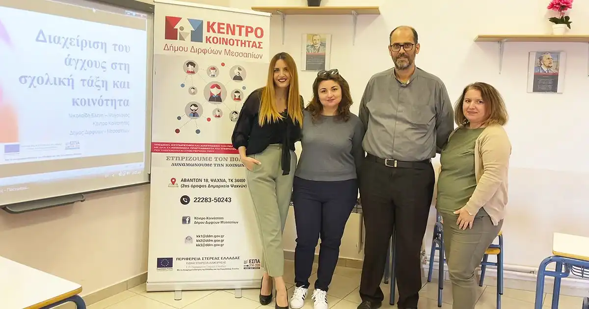 Το Κέντρο Κοινότητας του Δήμου Διρφύων-Μεσσαπίων στα πλαίσια διοργάνωσης εκδηλώσεων ευαισθητοποίησης με επιμορφωτικό χαρακτήρα και υπό το πρίσμα των δράσεων Ένα Σχολείο για Όλους”, υλοποίησε την Τετάρτη 8 Noεμβρίου 2023 ένα εκπαιδευτικό βιωματικό σεμινάριο στους εκπαιδευτικούς του Γυμνασίου Μακρυκάπας με τίτλο: “Μαθαίνω να διαχειρίζομαι περιστατικά Σχολικού Εκφοβισμού στη σχολική τάξη και κοινότητα”.
